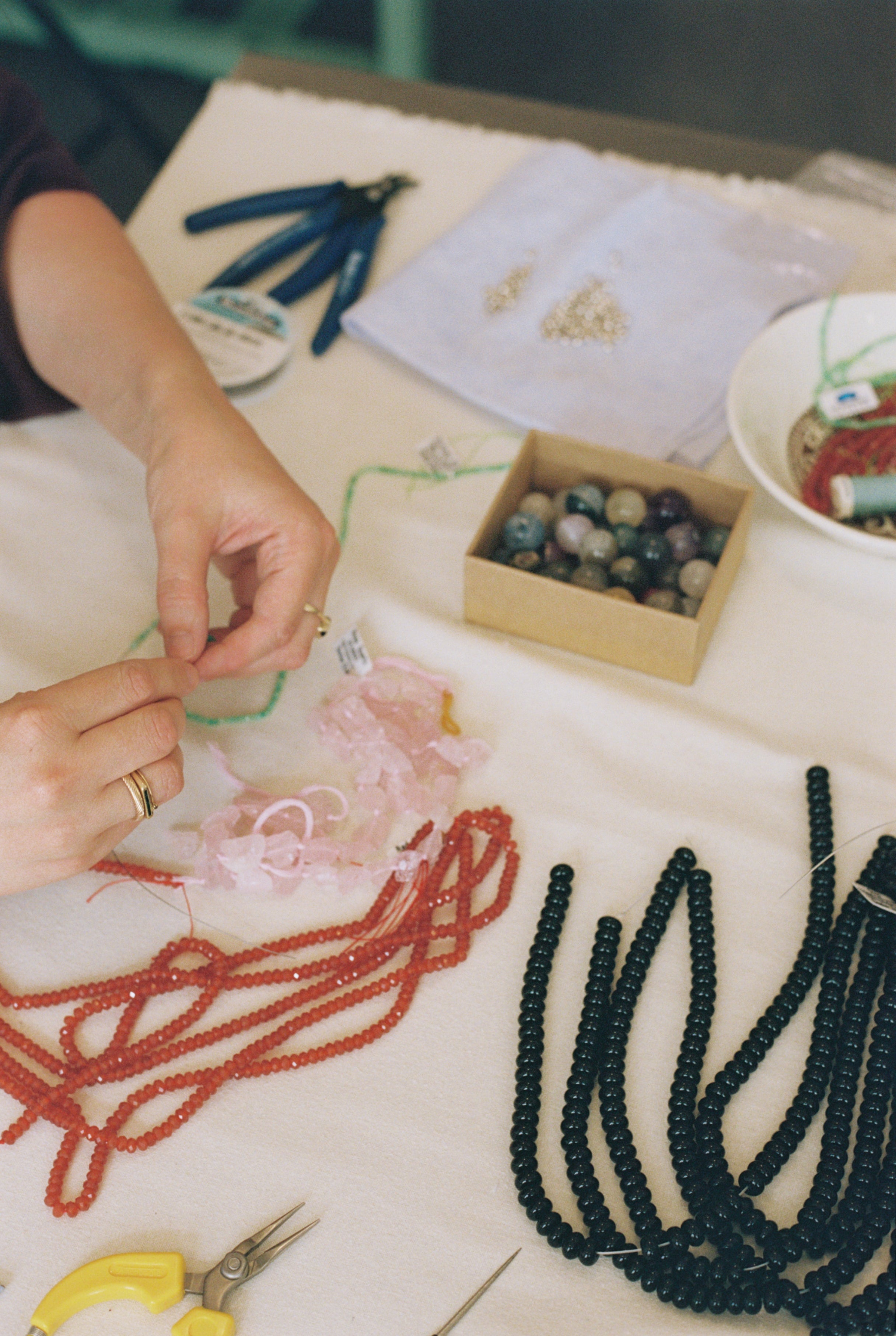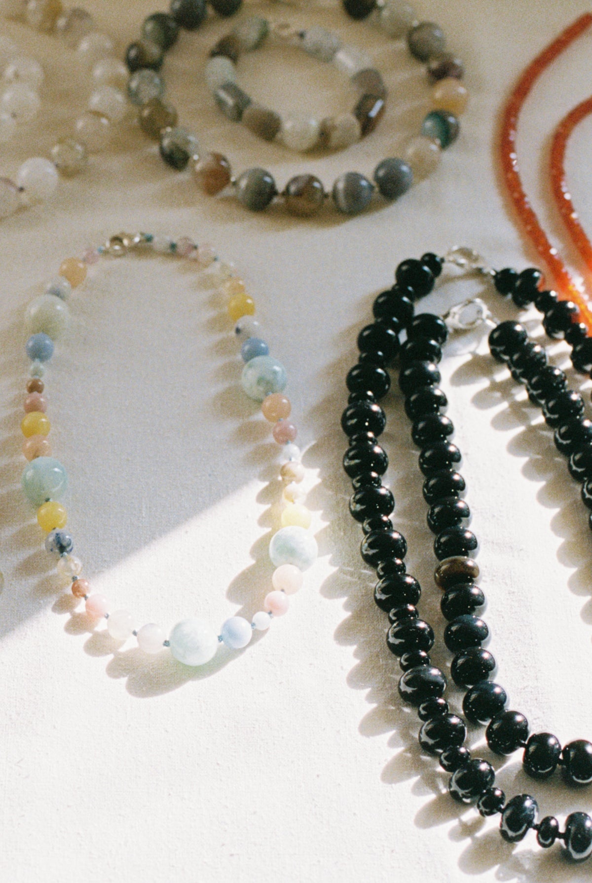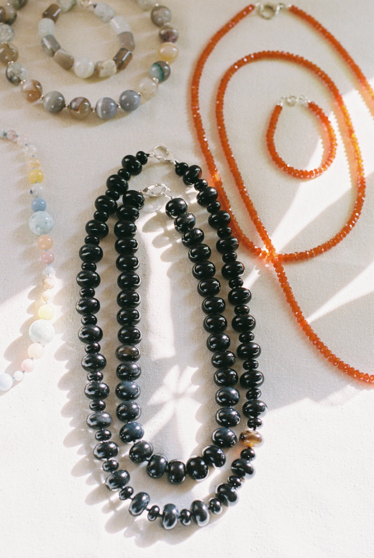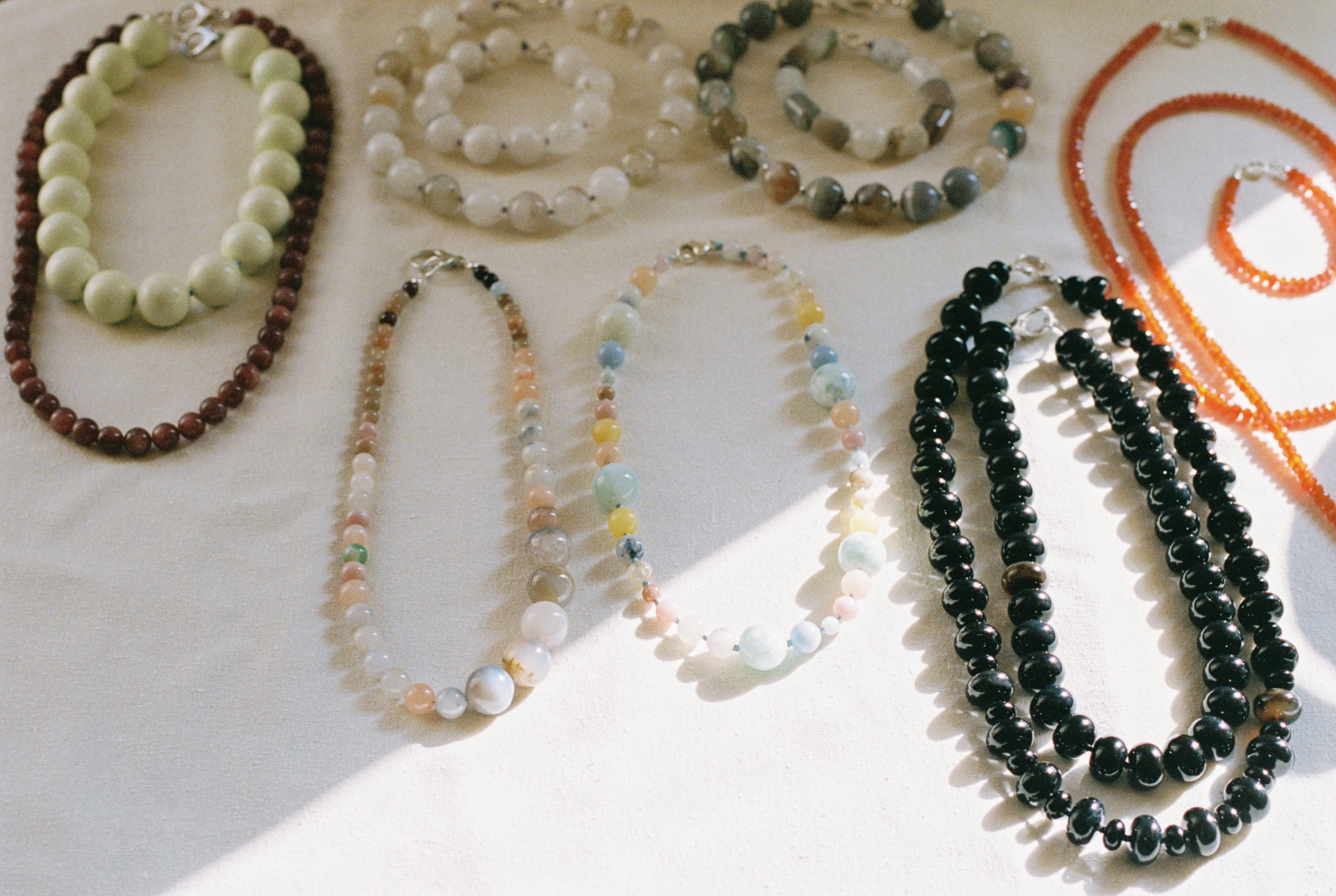 Phantom agate, strawberry quartz, azurite, onyx. Beaded by hand in Oslo, in no particular hurry.