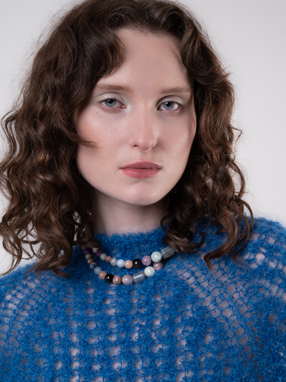 This beaded necklace is made from a combination of Phantom Agate, Sunstone, Peach Chalcedony, Angelite, Morganite, Obsidian, Cherry Blossom Agate, Dumortierite in Quartz, Moonstone, Aquamarine and Jade. It is paired with a sterling silver clasp. Each stone is unique, creating subtle variations in every piece, ensuring no two necklaces are exactly alike.