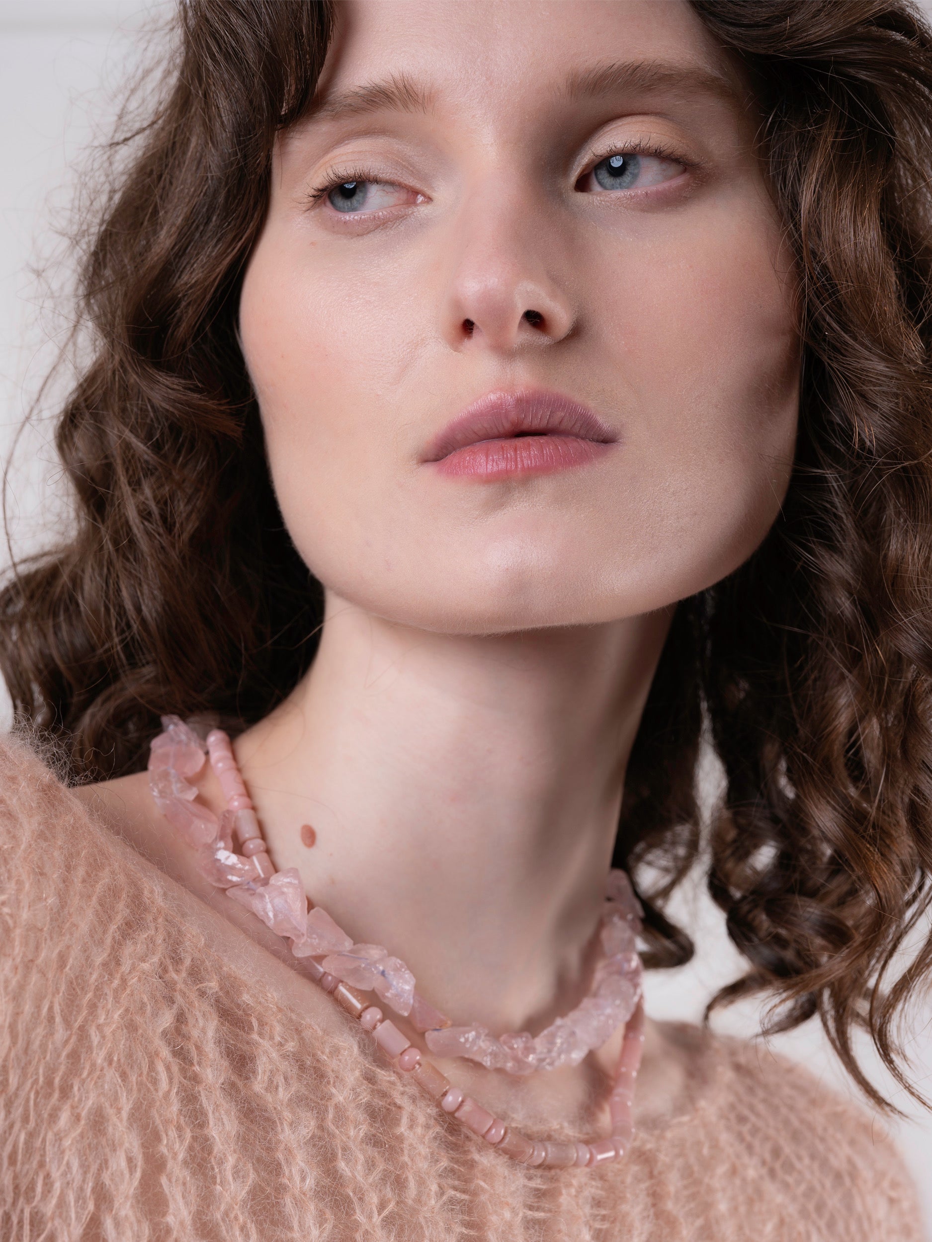 This beaded necklace is made from AAA grade Rose Quartz beads in freeform. it is hand knotted on lavender silk thread and paired with a sterling silver clasp. Each stone is unique, creating subtle variations in every piece, ensuring no two necklaces are exactly alike.