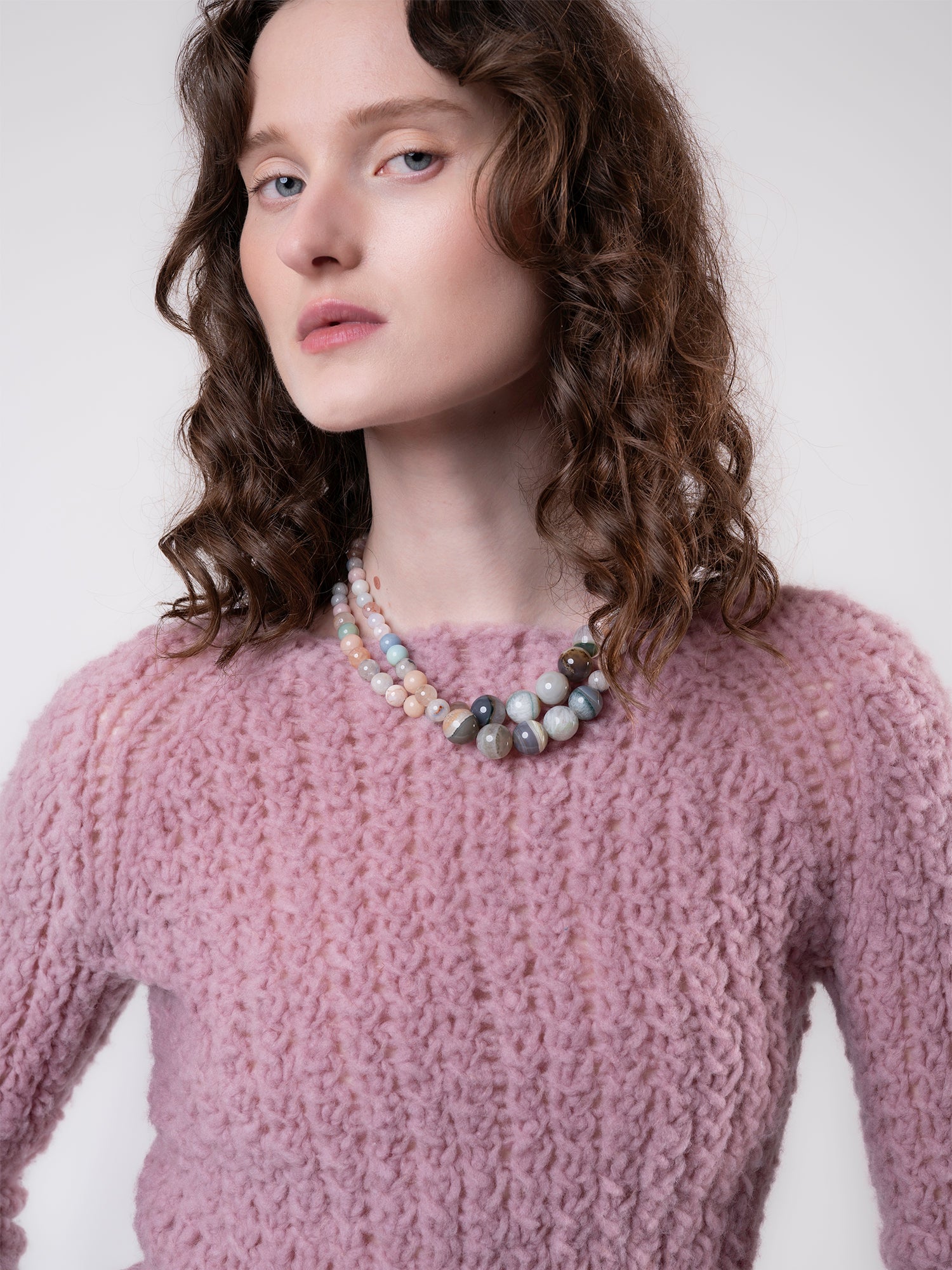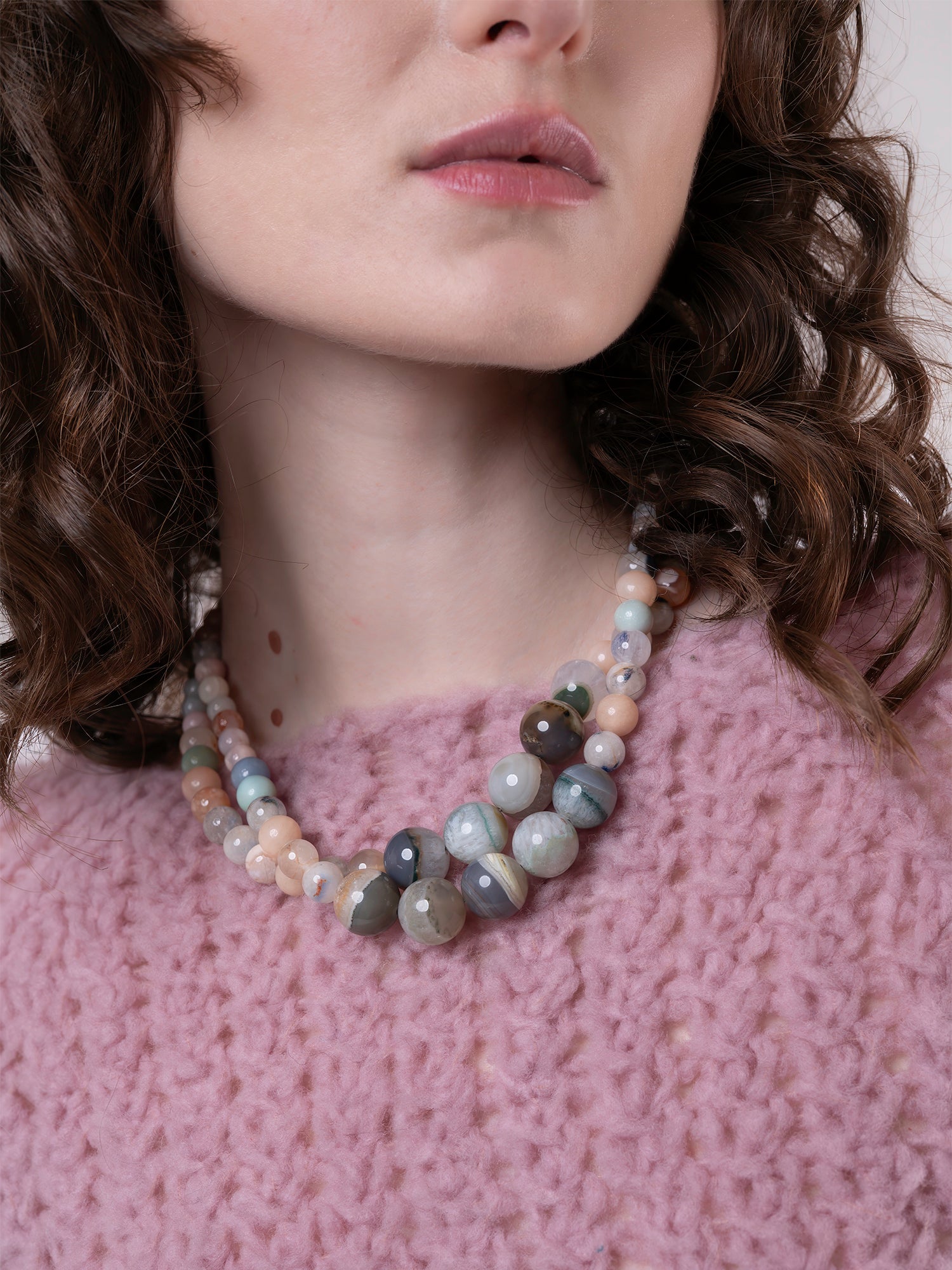 This beaded necklace is made from a combination of Phantom Agate, Sunstone, Amazonite, Peach Chalcedony, Cherry Blossom Agate, Dumortierite, Moonstone and Green Burmese Jade. It is paired with a sterling silver clasp. Each stone is unique, creating subtle variations in every piece, ensuring no two necklaces are exactly alike.