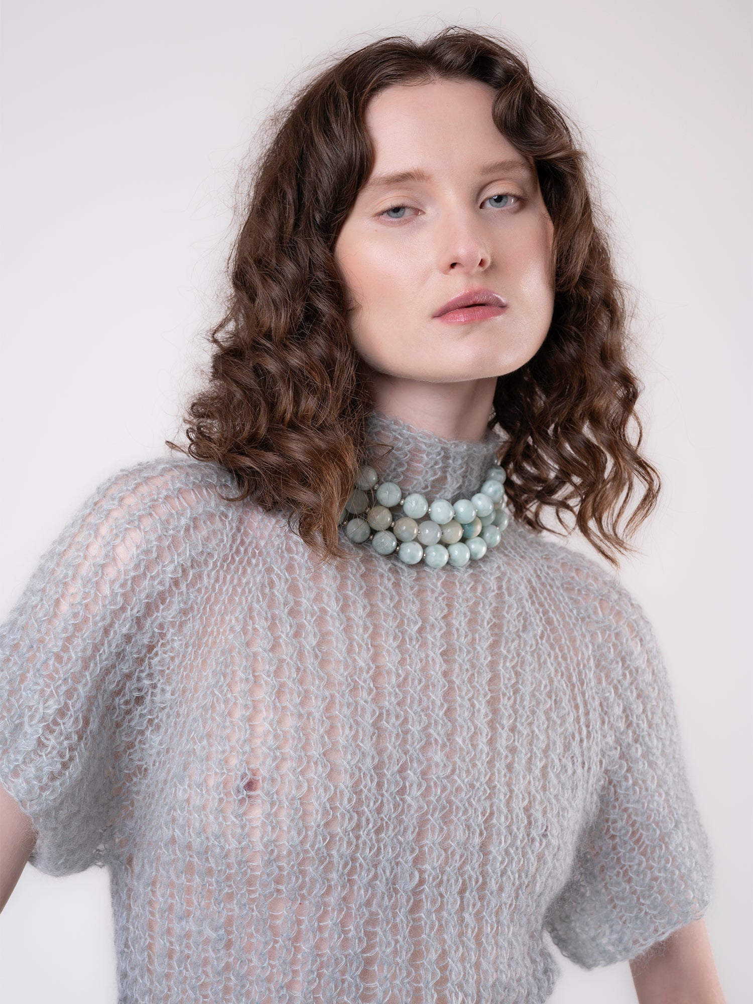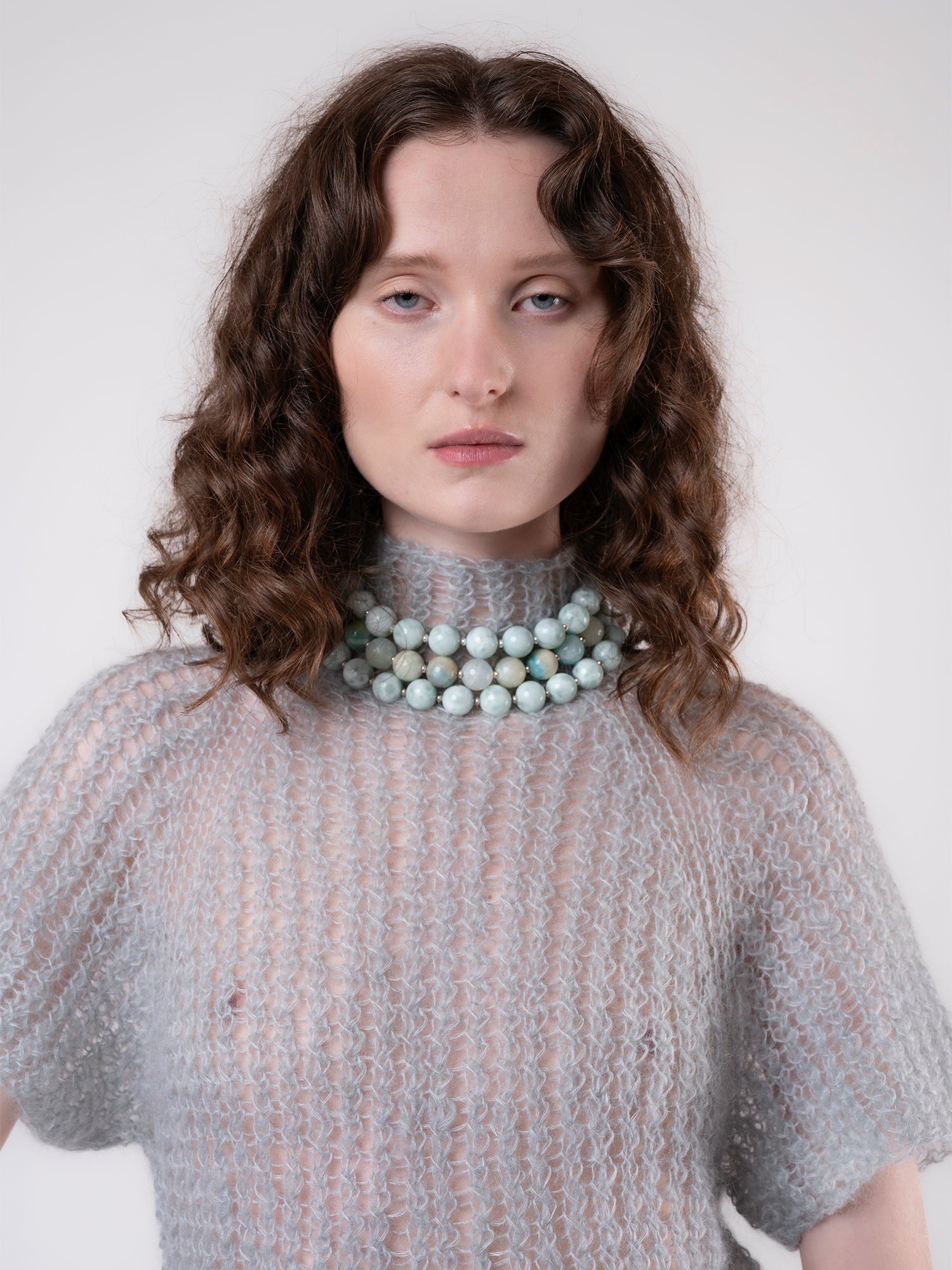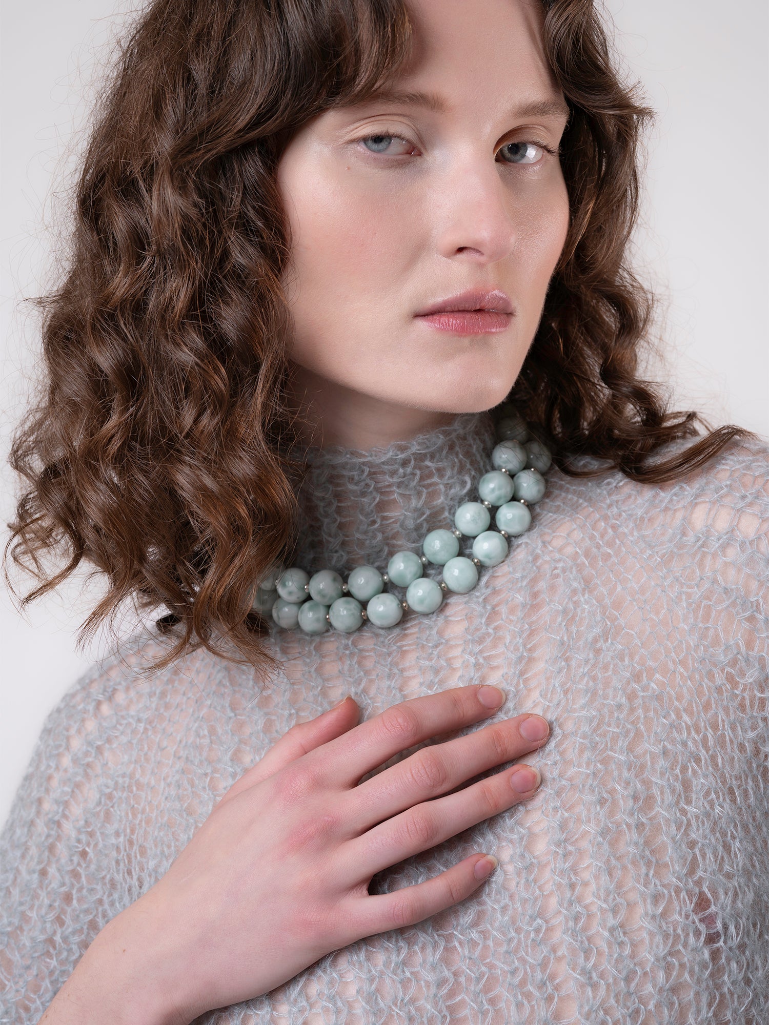 This big bead necklace features 16 mm Green Moonstone beads paired with sterling silver disc beads and a sterling silver clasp. Each stone is unique, creating subtle variations in every piece, ensuring no two necklaces are exactly alike.