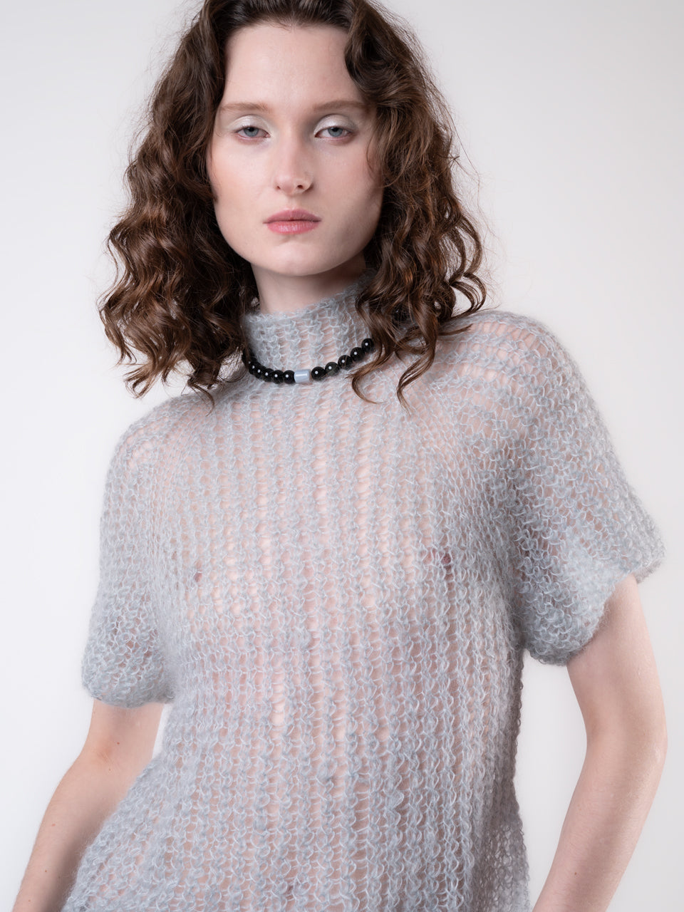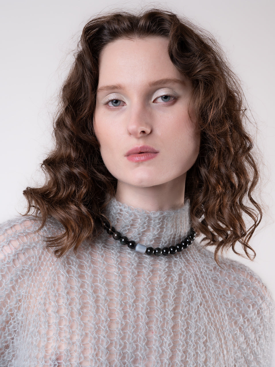 This beaded necklace is made from a combination of Obsidian and one Phantom Agate. It is paired with a sterling silver clasp. Each stone is unique, creating subtle variations in every piece, ensuring no two necklaces are exactly alike.