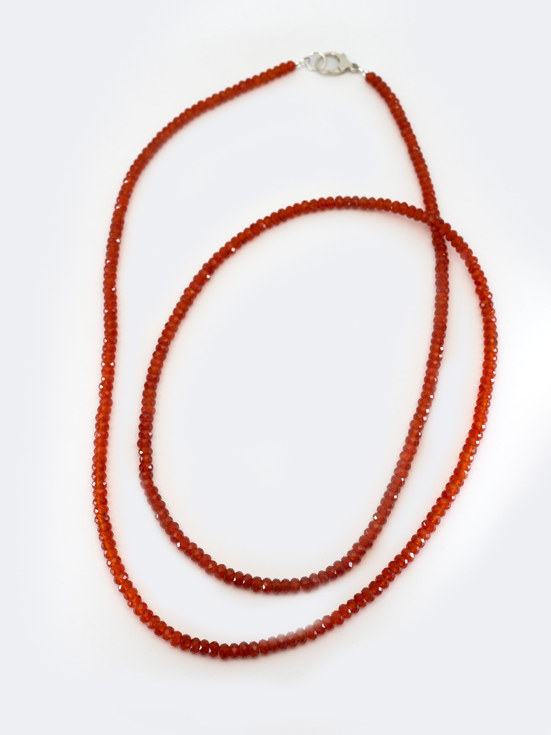 This very long, beaded necklace features orange-red, faceted agate beads, paired with a sterling silver clasp. Each stone is unique, creating subtle variations in every piece, ensuring no two necklaces are exactly alike.