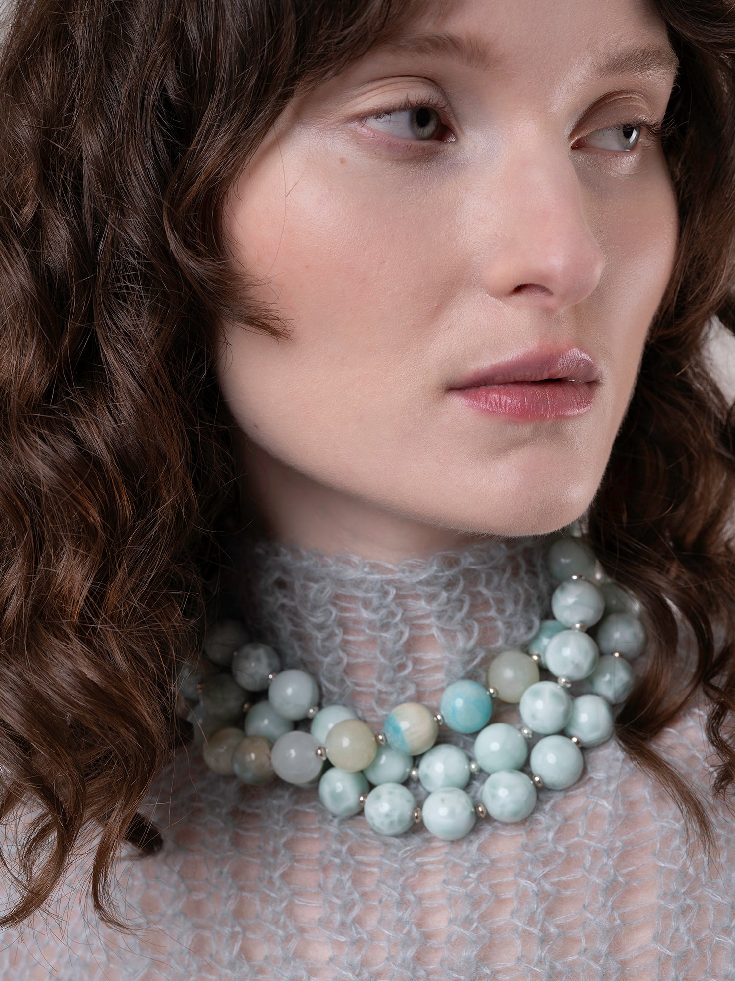 This big bead necklace features 16 mm Hemimorphite beads paired with sterling silver disc beads and a sterling silver clasp. Each stone is unique, creating subtle variations in every piece, ensuring no two necklaces are exactly alike.