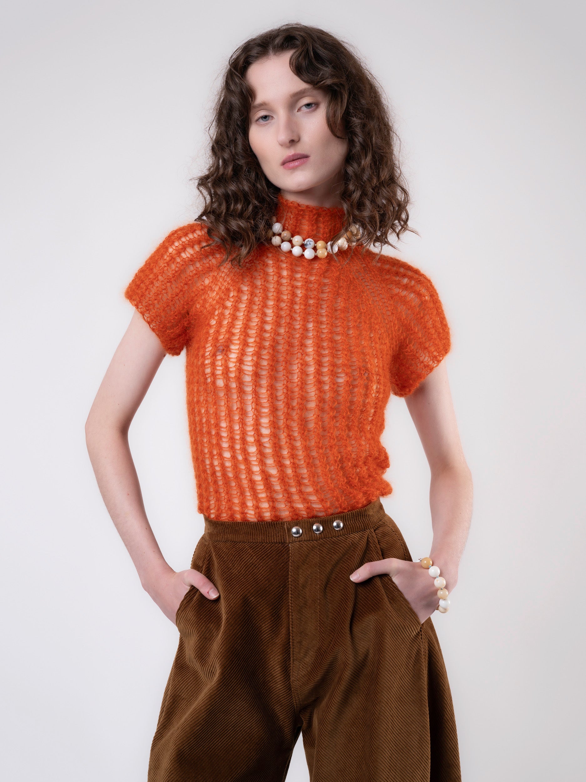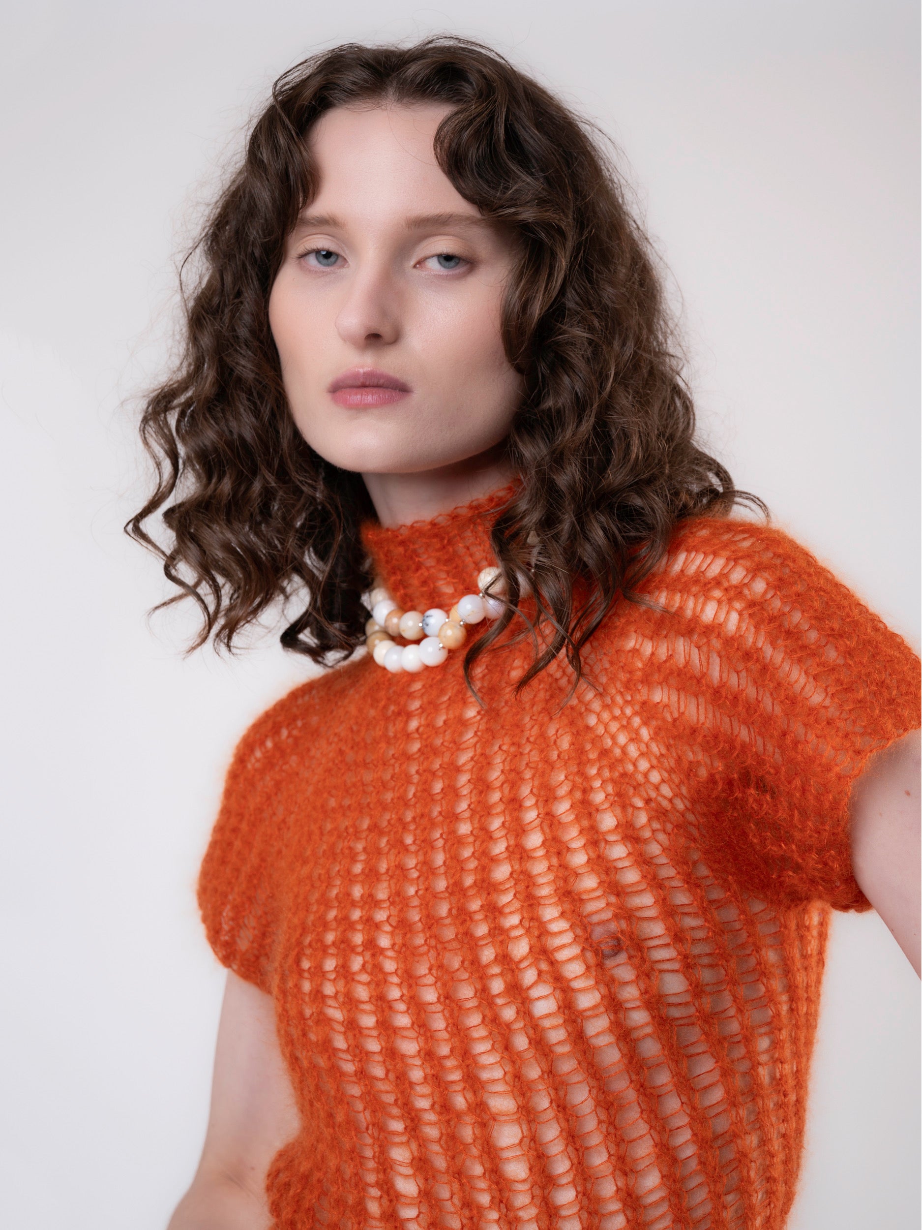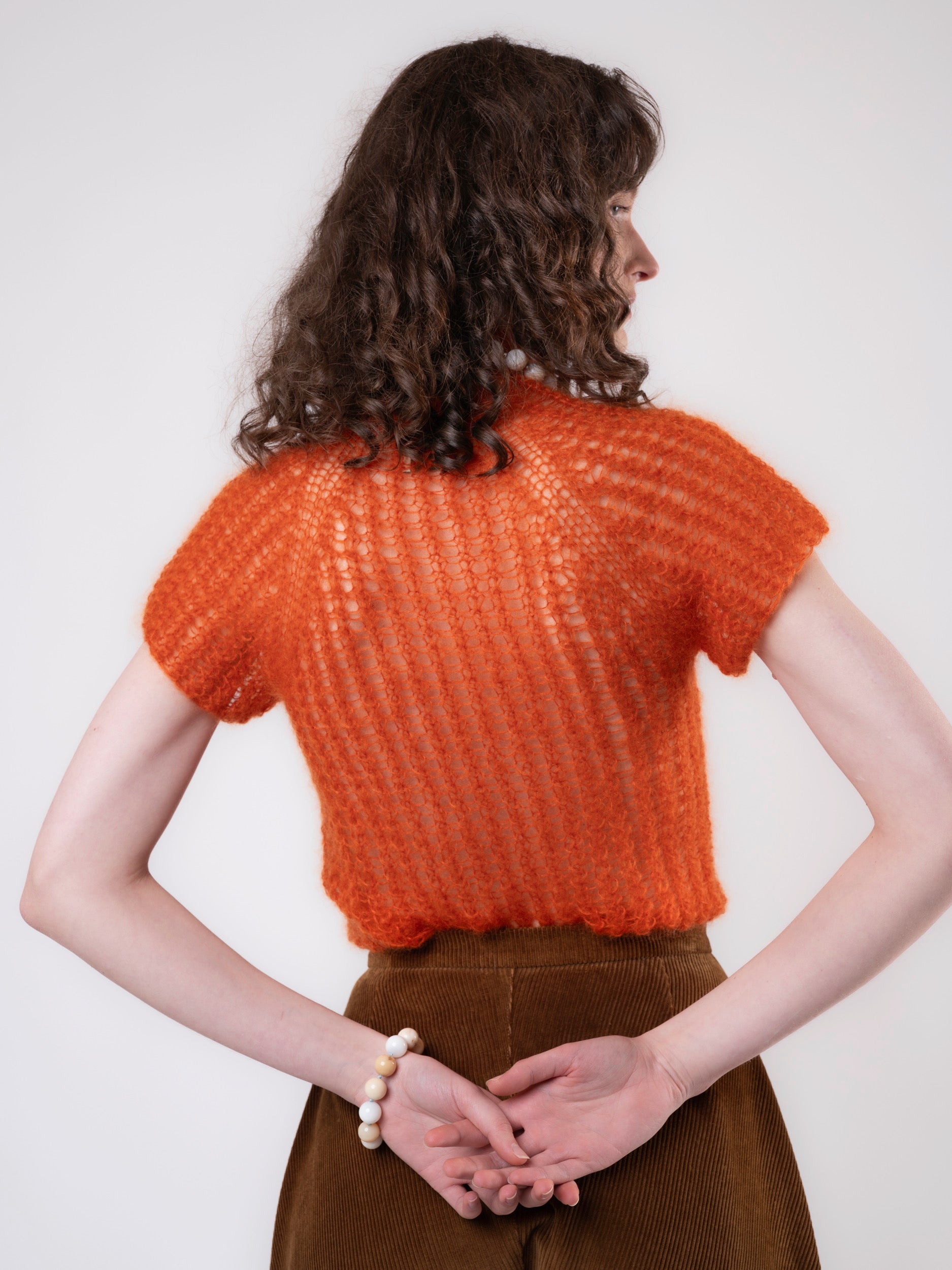 A hand-knitted t-shirt made from a thin mohair blend yarn. It fits a slim, and it is knitted using a technique that makes it very airy and sheer.