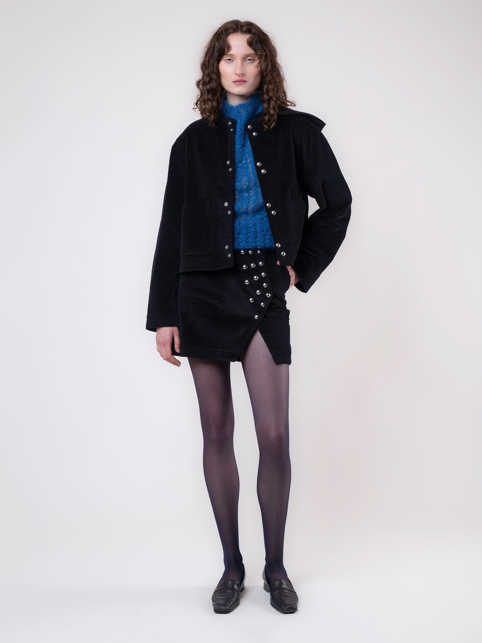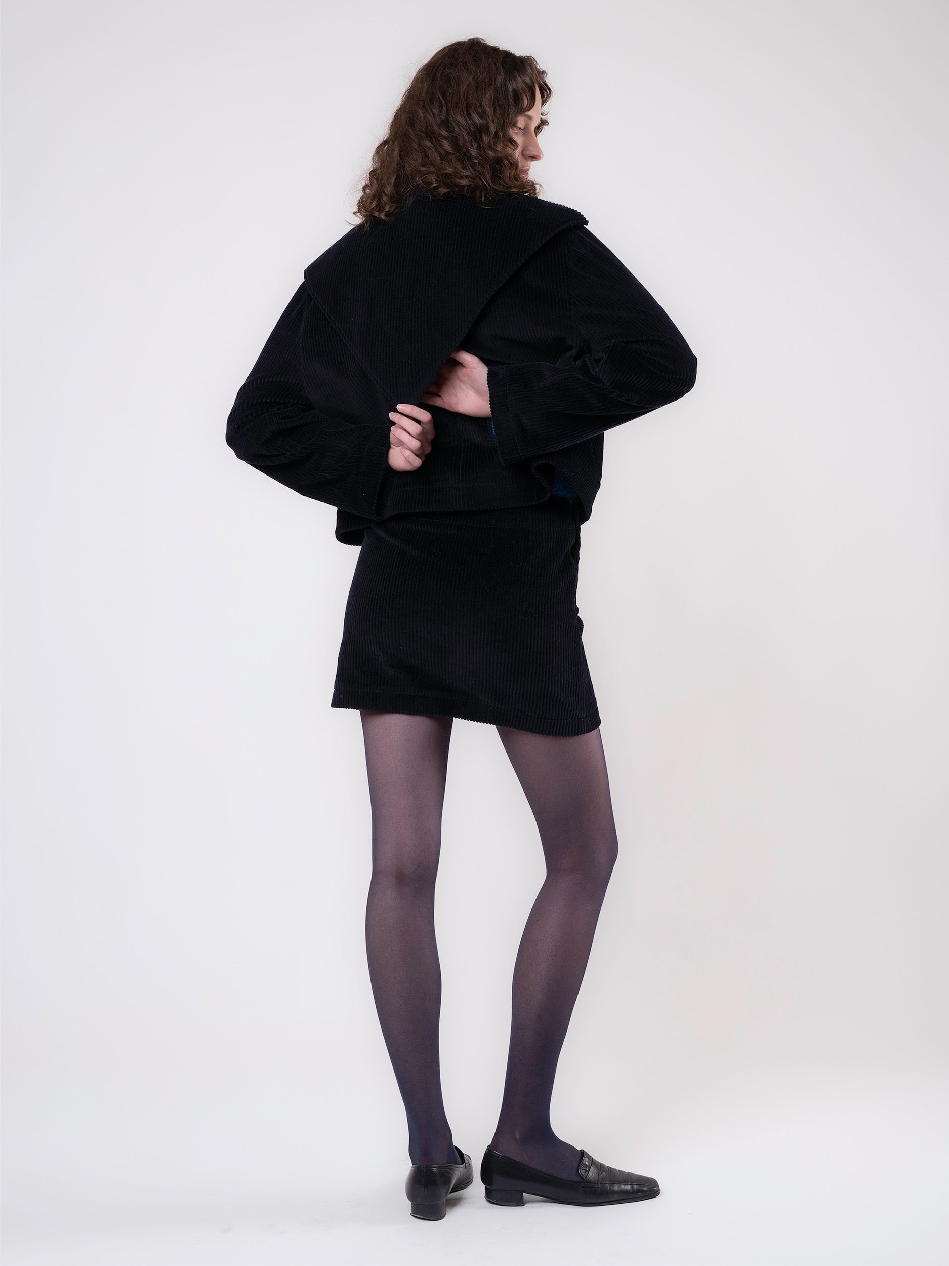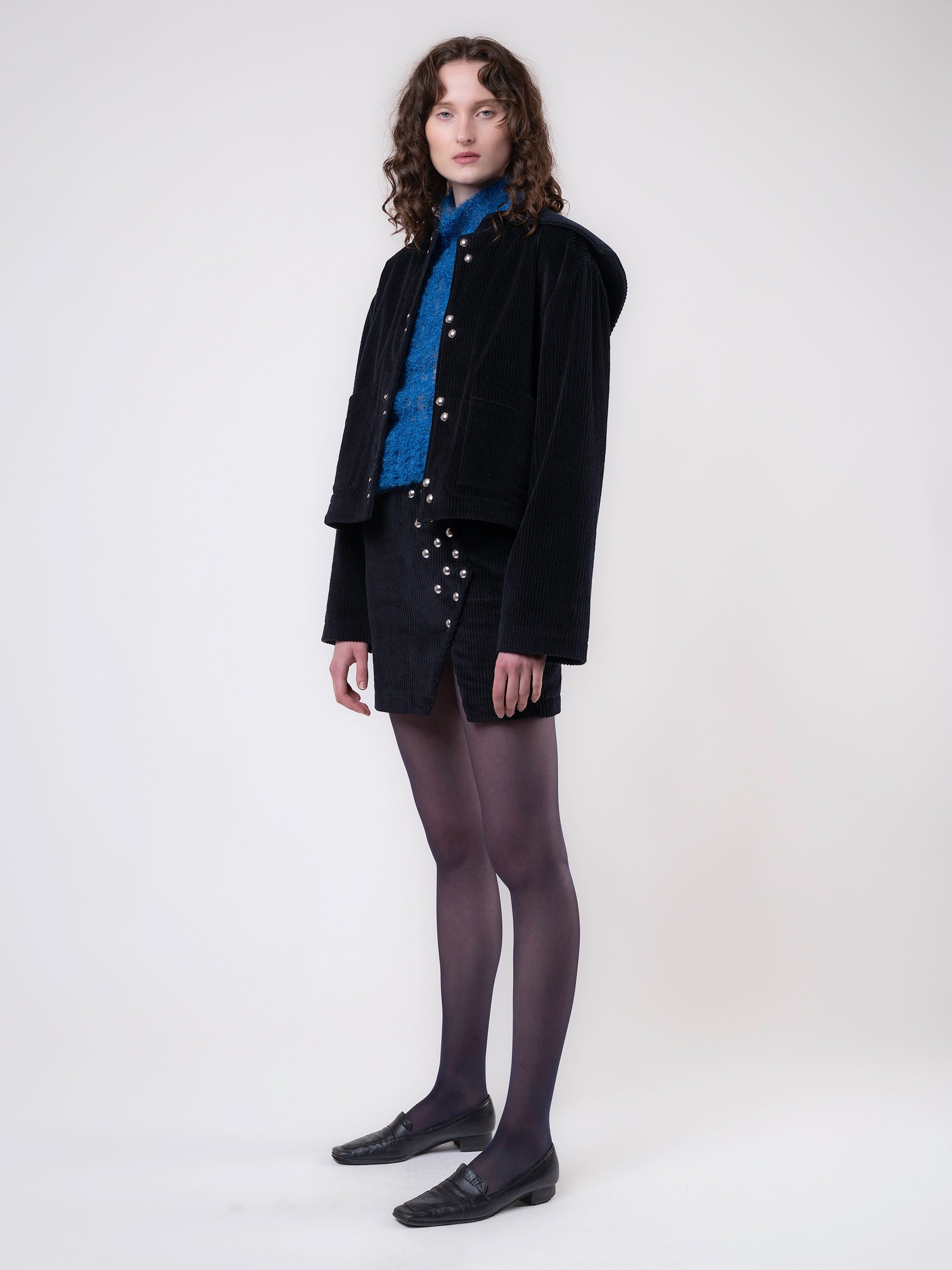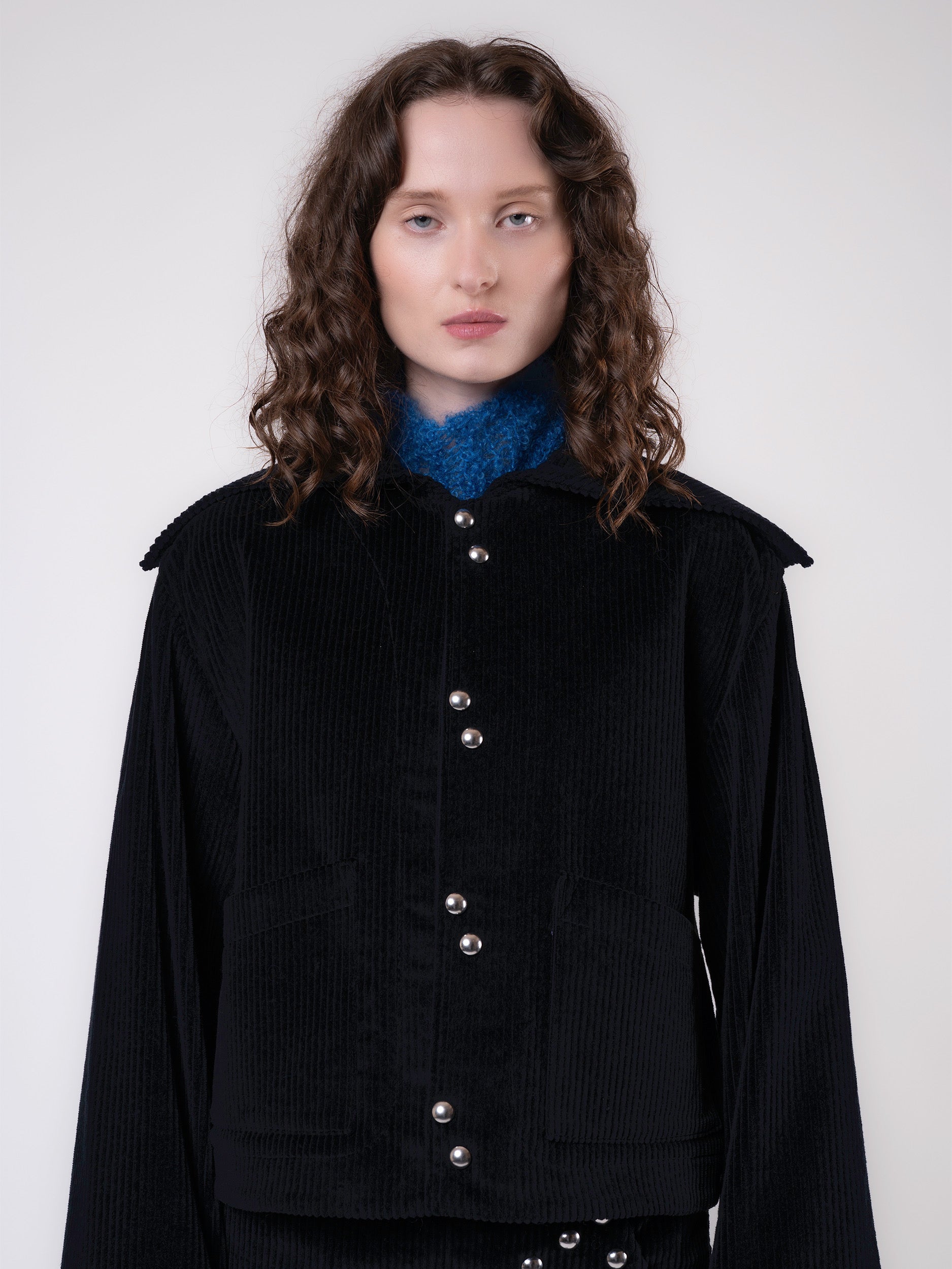 A gorgeous little jacket in a butter soft, deadstock corduroy, with an eye catching triangular collar and signature buttons. . It features diagonal patch pockets, and rounded snaps placed in pairs diagonally. Made in our studio by skilled hands.