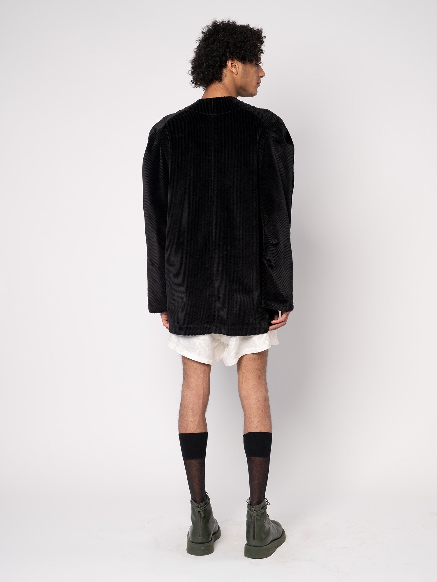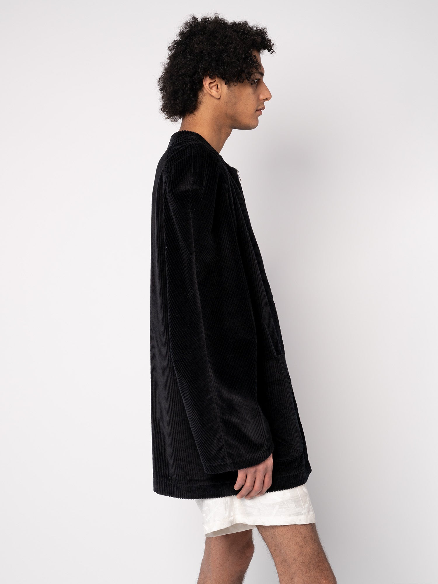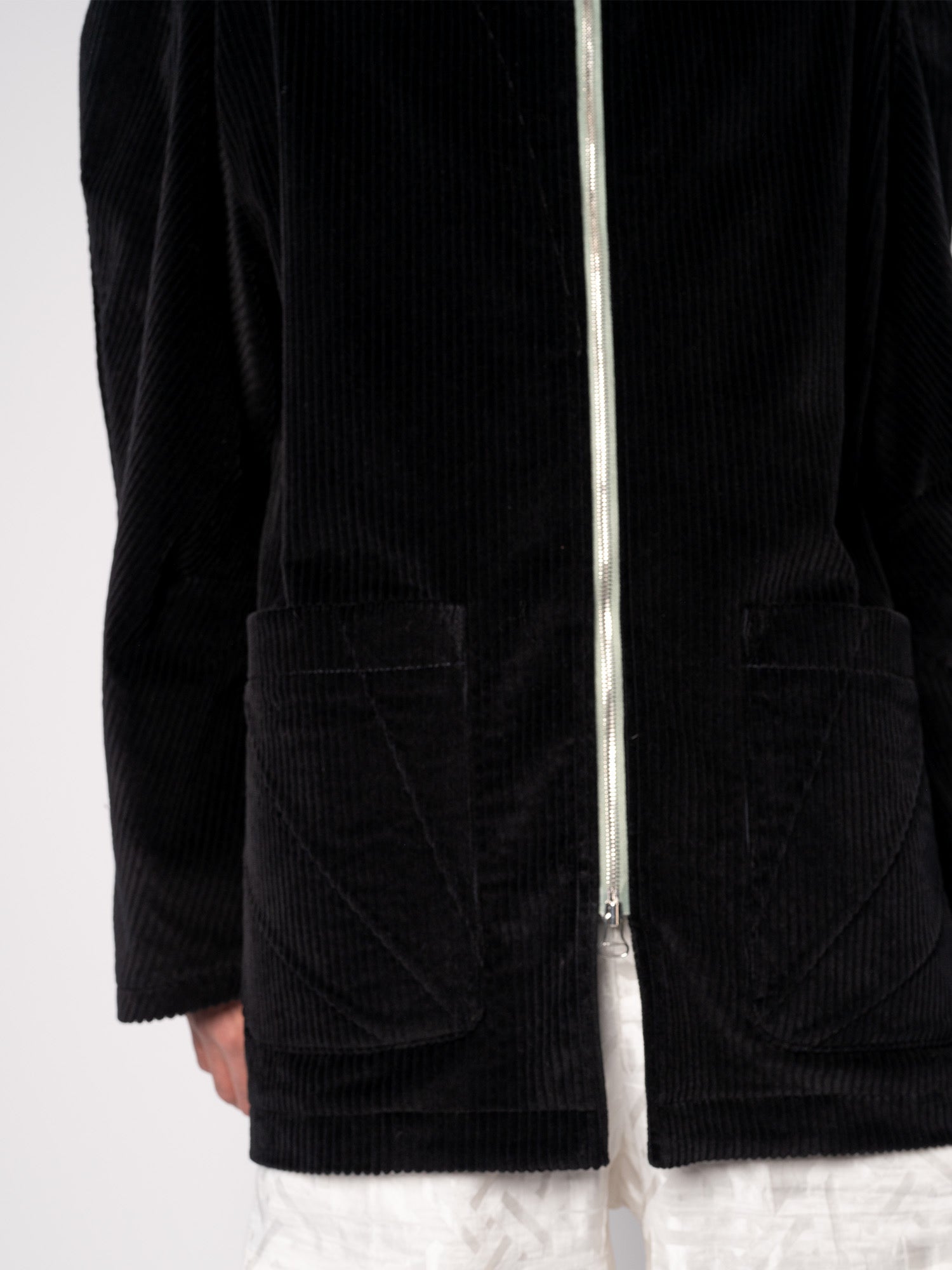 This slightly long, curved shoulder jacket is made from deadstock black corduroy, which originated from Dries Van Noten. It will only be produced in very limited numbers, due to the scarcity of the fabric. It features ragland sleeves with darts in a sunshine shape, rounding off the shoulders and elbows, patch pockets with seams, and a visible green Riri zip.