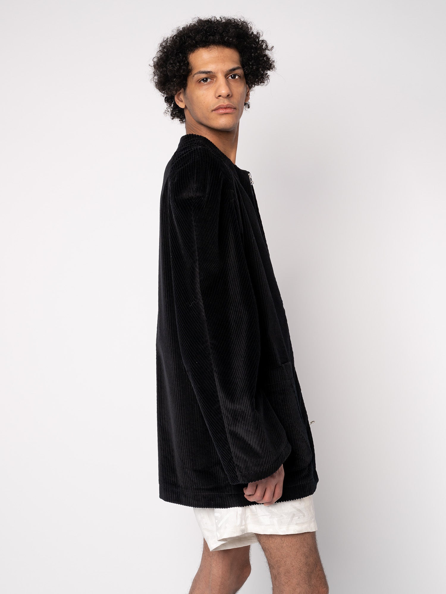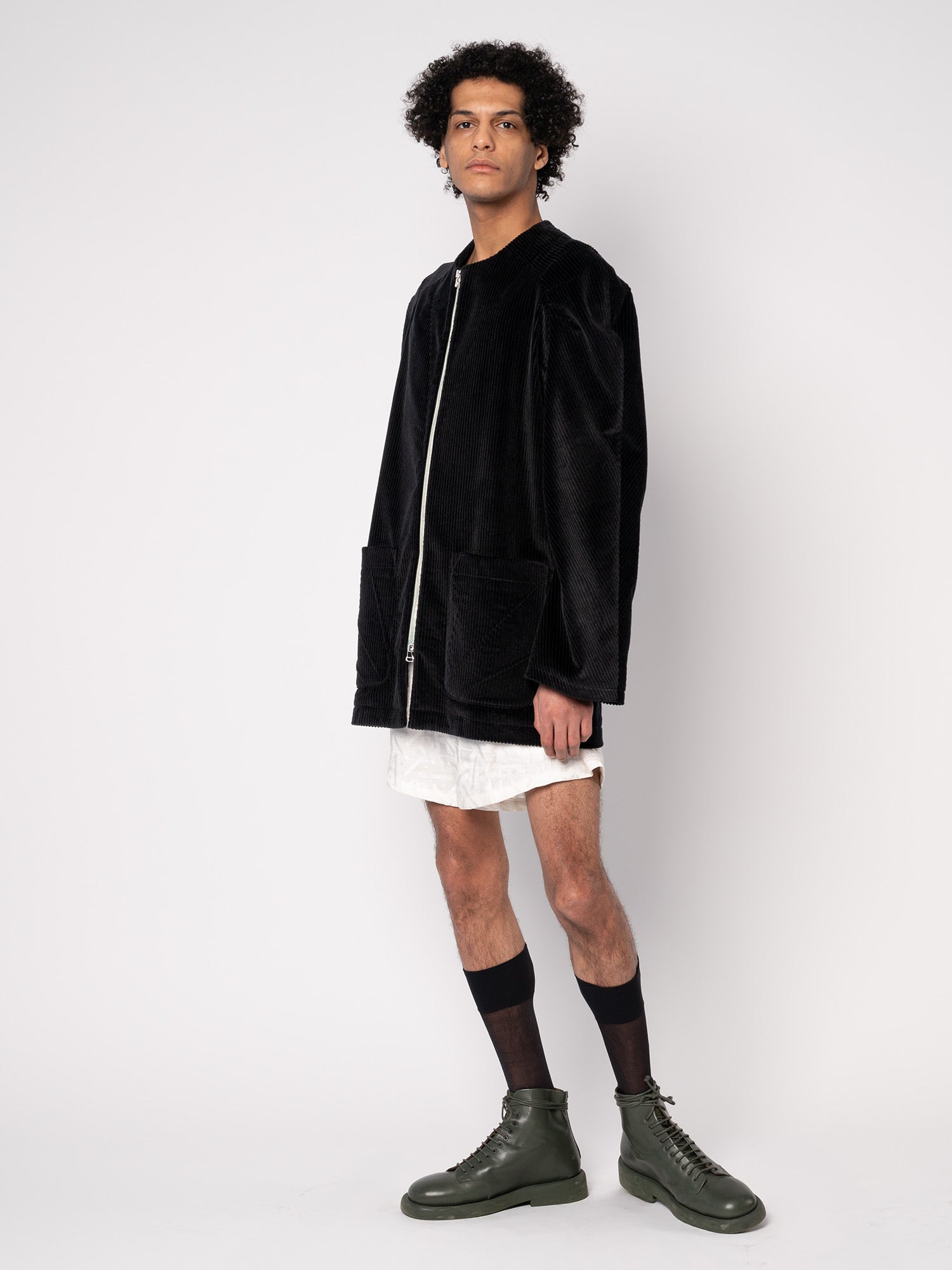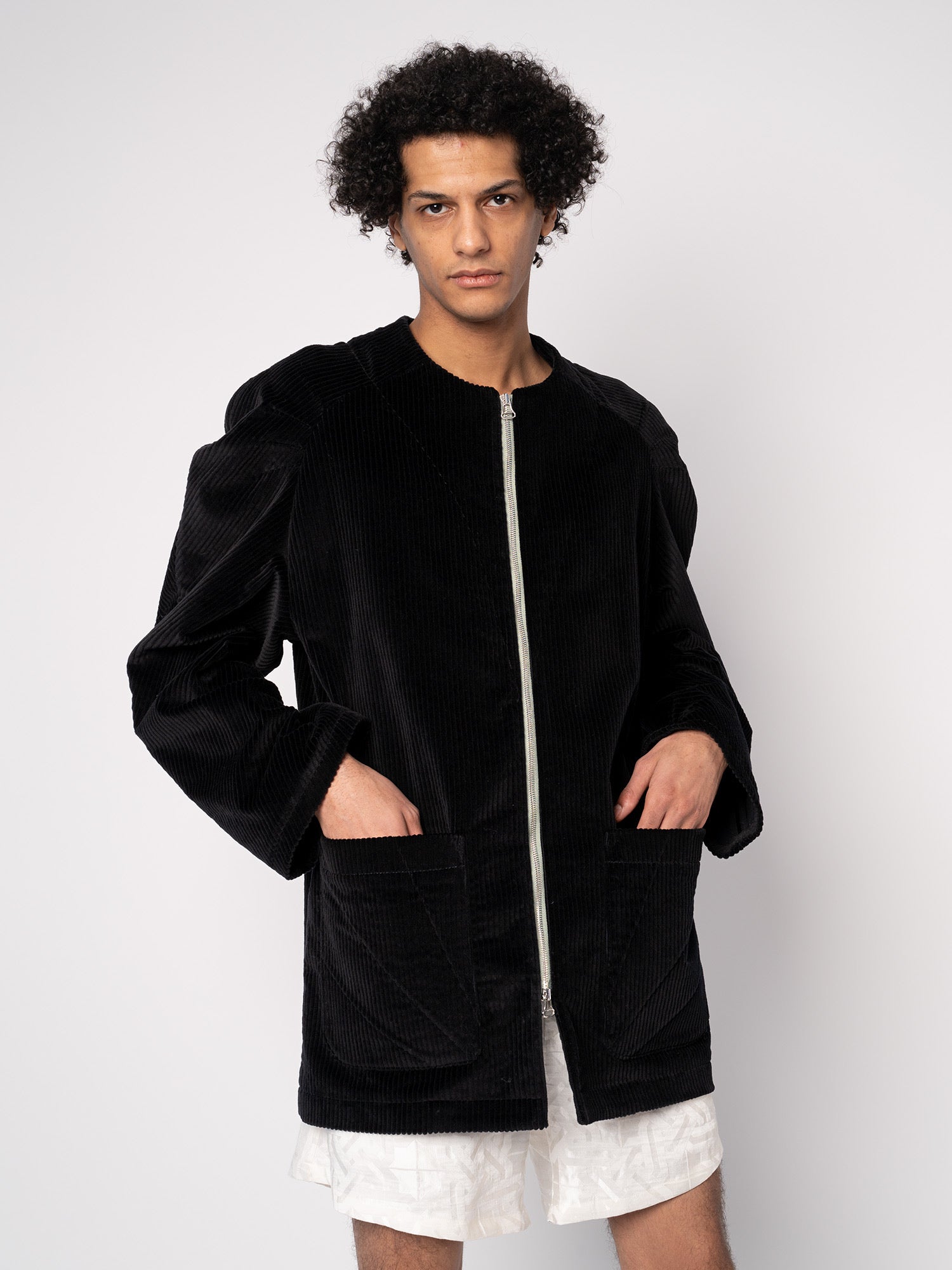 This slightly long, curved shoulder jacket is made from deadstock black corduroy, which originated from Dries Van Noten. It will only be produced in very limited numbers, due to the scarcity of the fabric. It features ragland sleeves with darts in a sunshine shape, rounding off the shoulders and elbows, patch pockets with seams, and a visible green Riri zip.