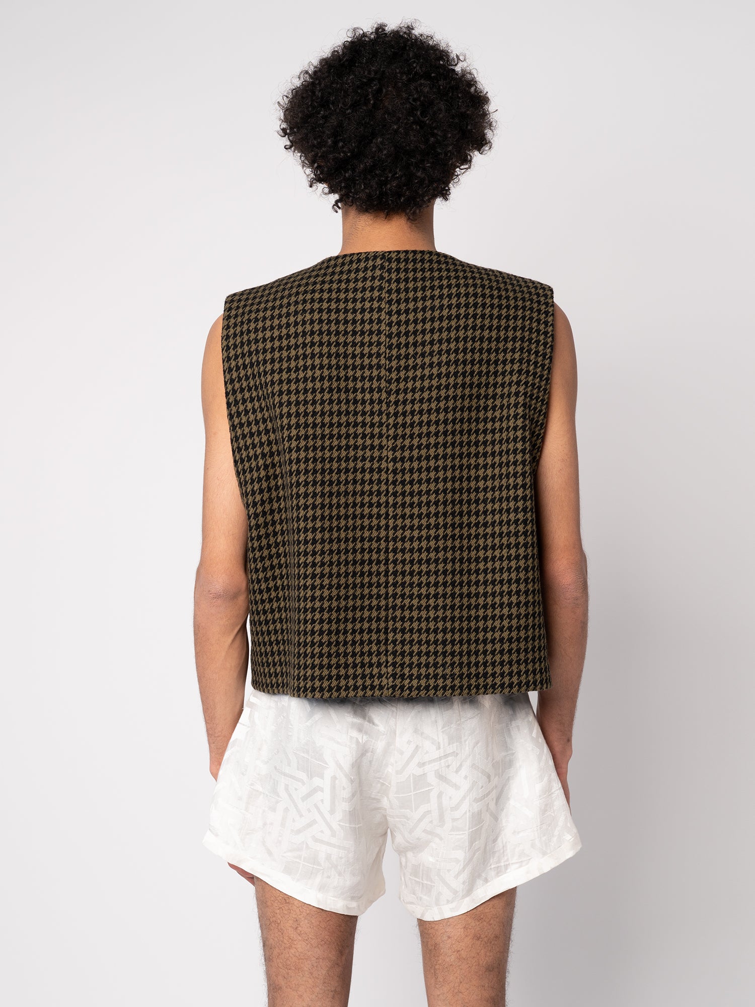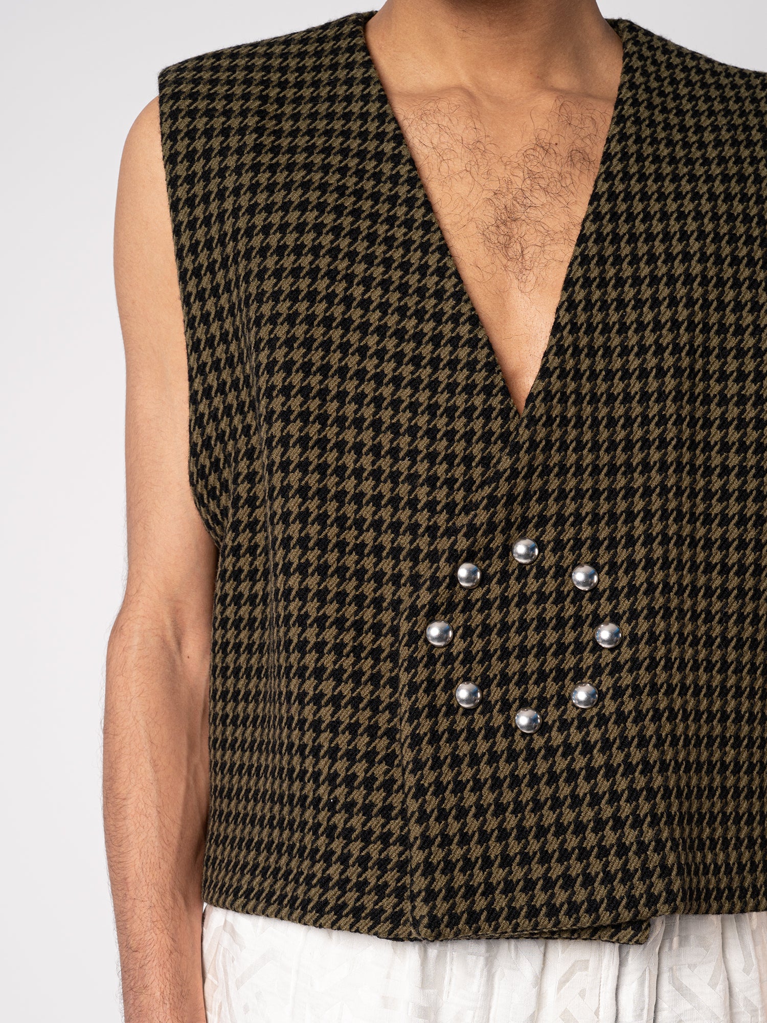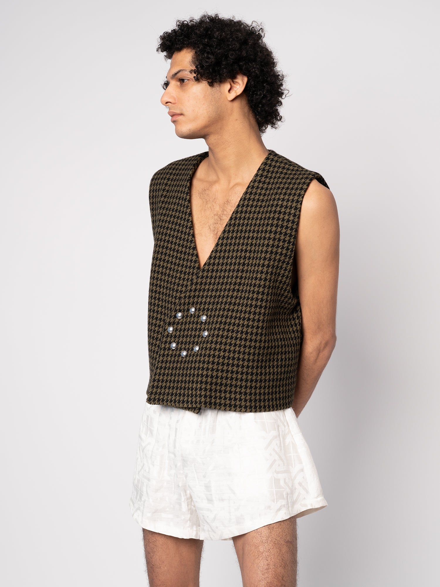 This fab, boxy, waistcoat is made from a deadstock wool houndstooth fabric from Haider Ackerman. It will only be produced in very limited quantities. It features rounded snaps placed in a circle, no lining, but beautiful finishing.
