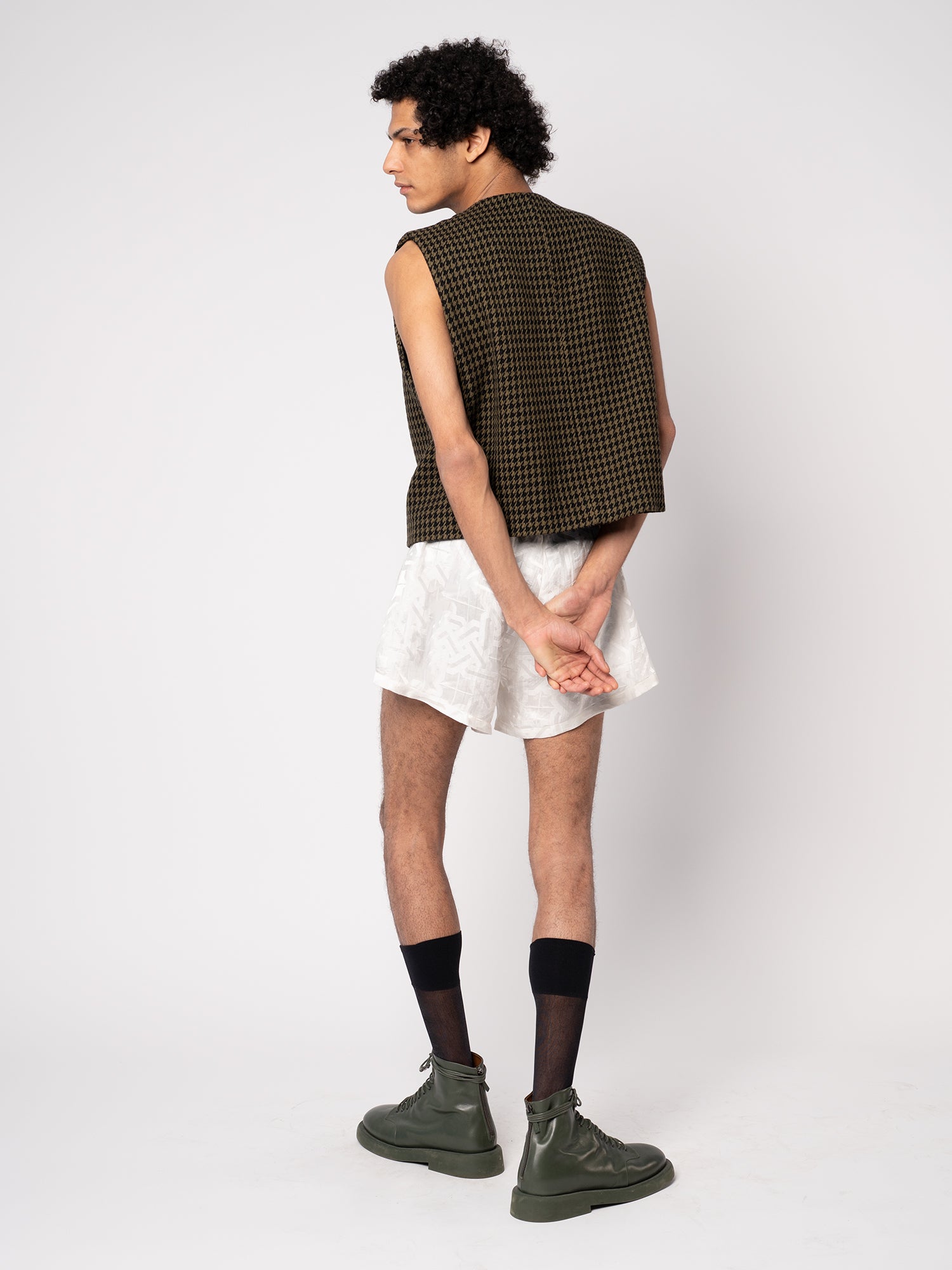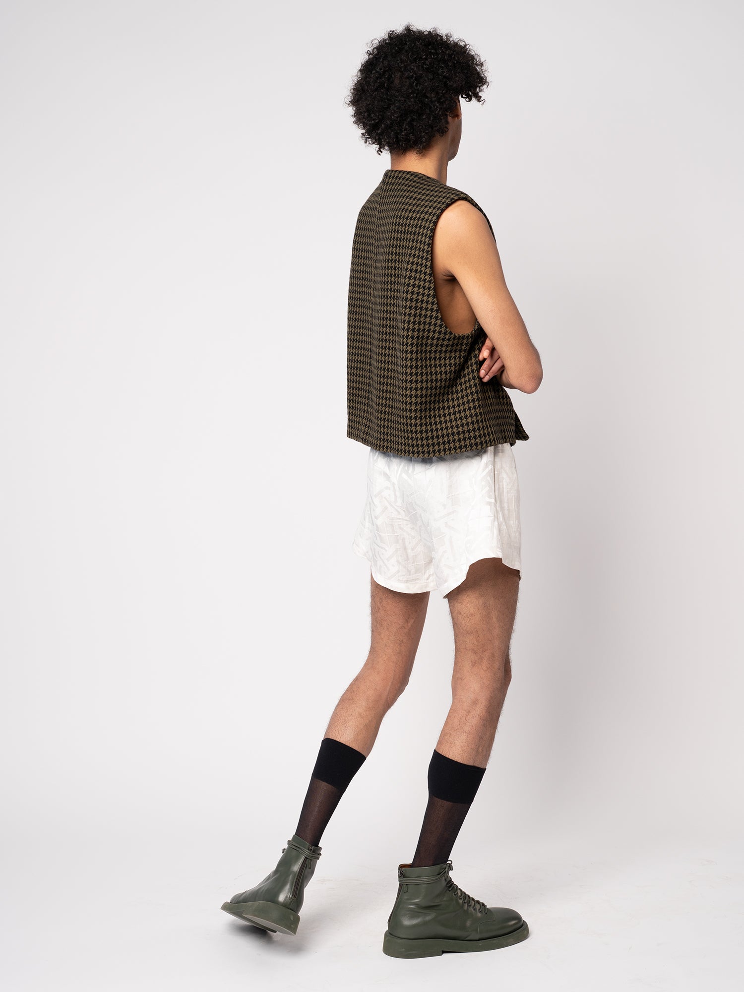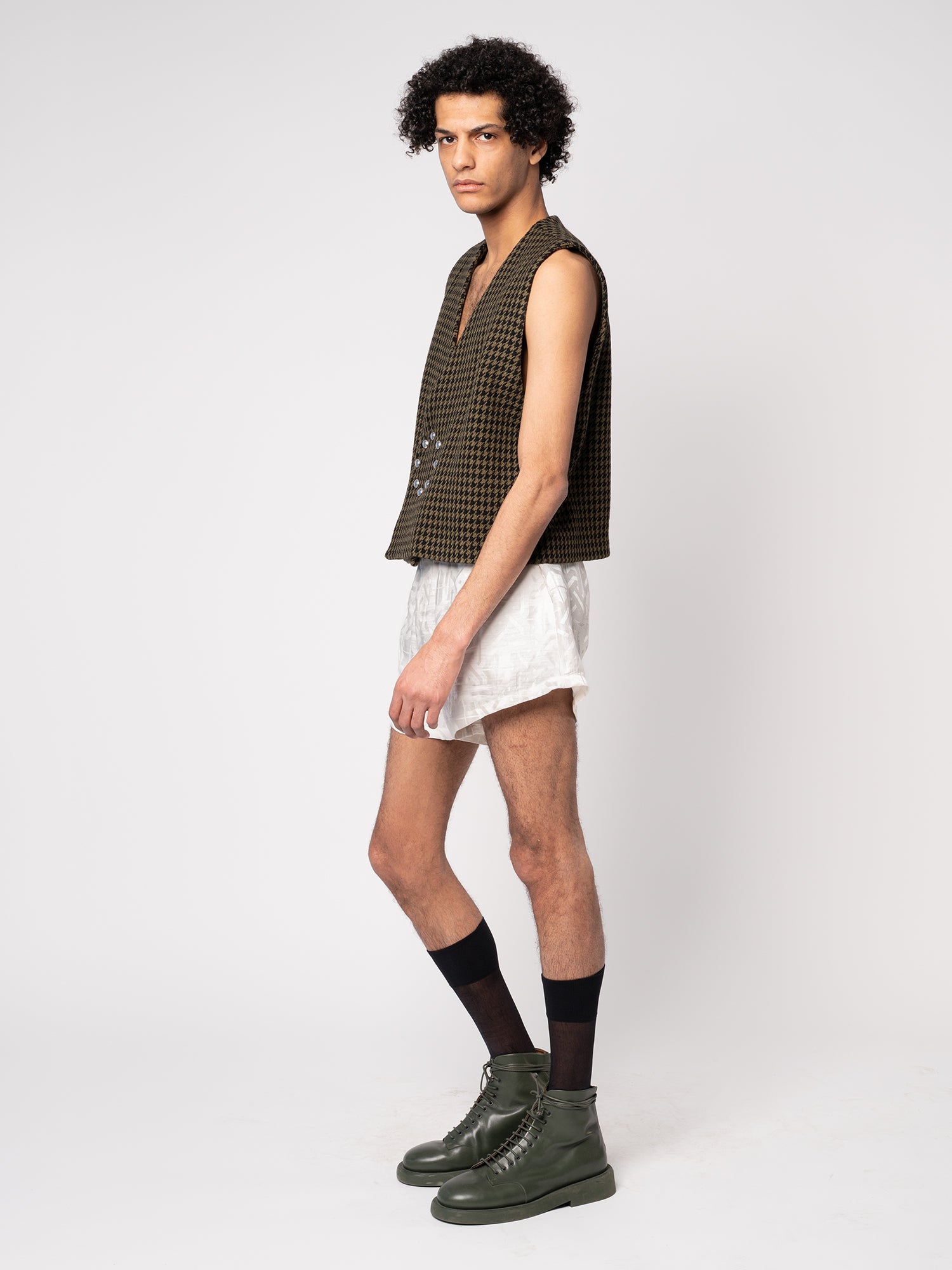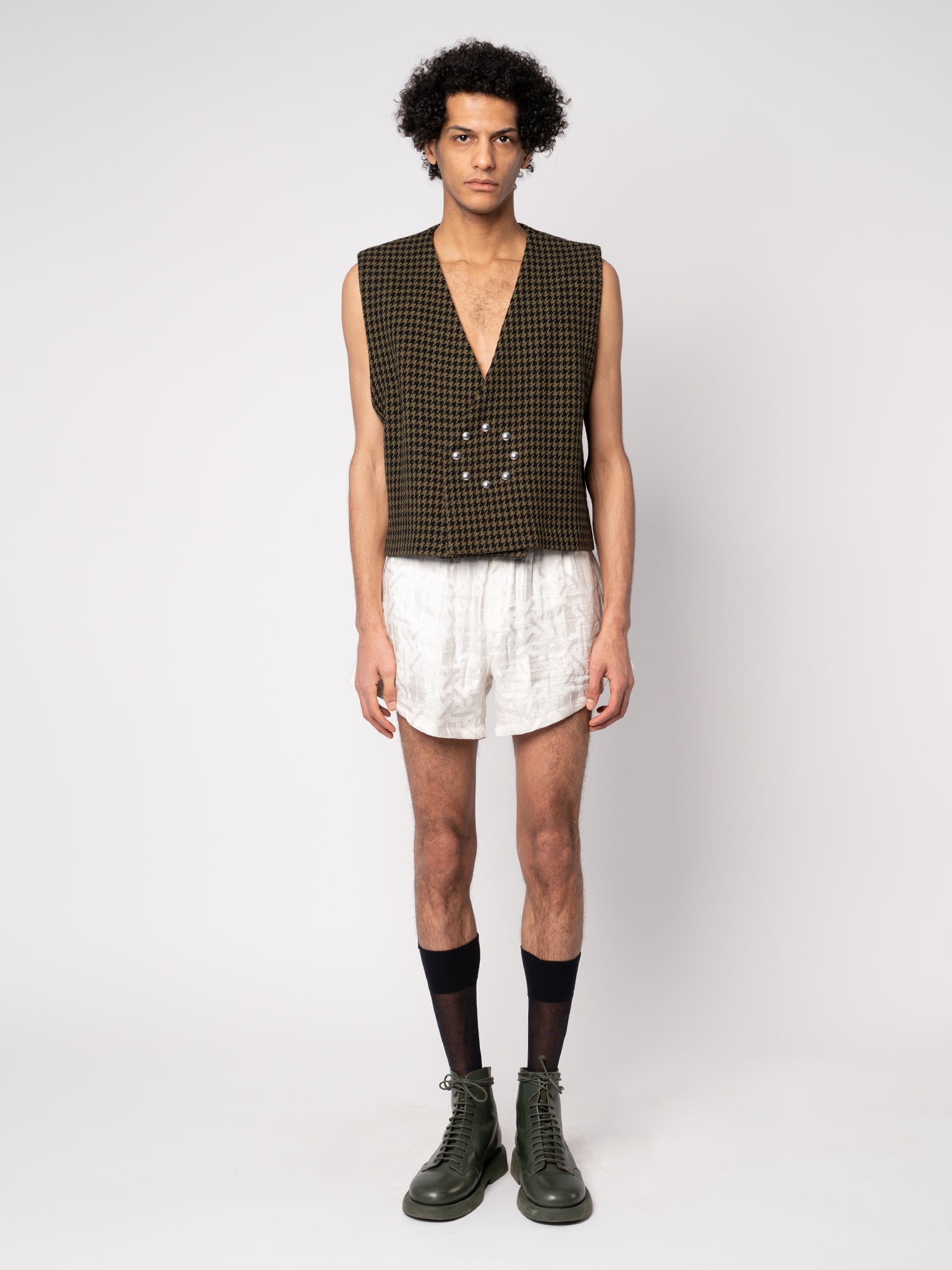 This fab, boxy, waistcoat is made from a deadstock wool houndstooth fabric from Haider Ackerman. It will only be produced in very limited quantities. It features rounded snaps placed in a circle, no lining, but beautiful finishing.