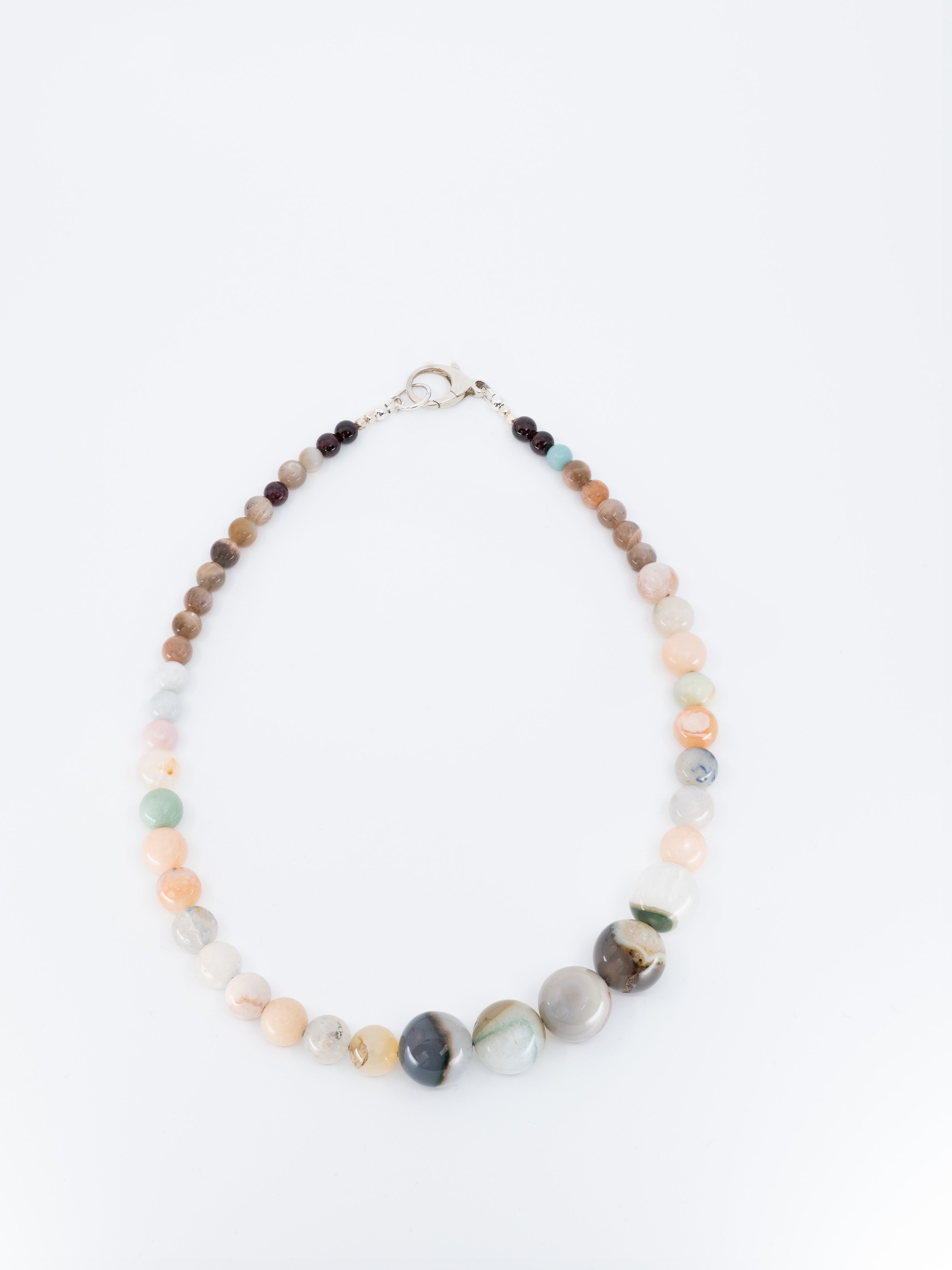 This beaded necklace is made from a combination of Phantom Agate, Sunstone, Amazonite, Peach Chalcedony, Cherry Blossom Agate, Dumortierite, Moonstone and Green Burmese Jade. It is paired with a sterling silver clasp. Each stone is unique, creating subtle variations in every piece, ensuring no two necklaces are exactly alike.