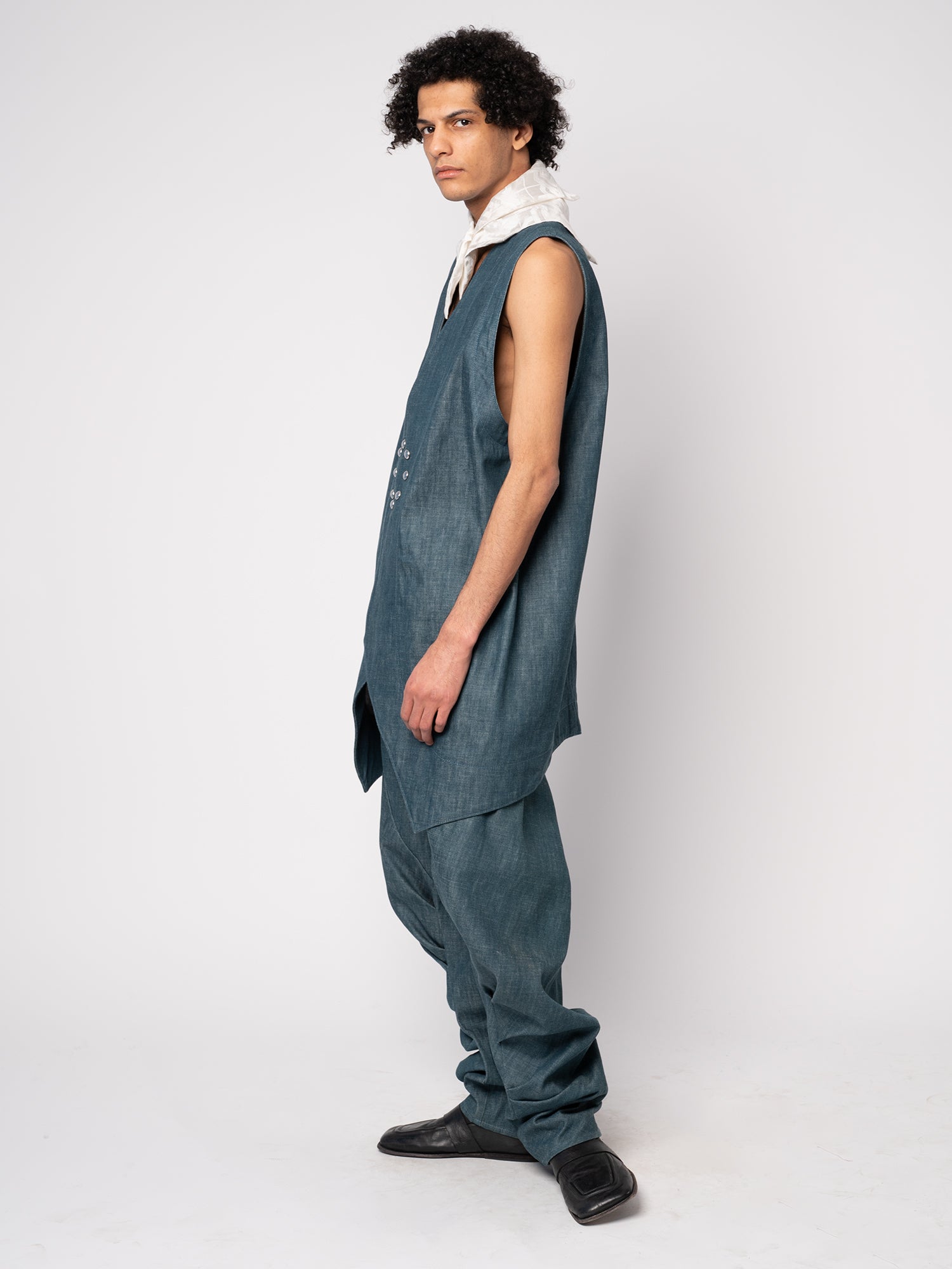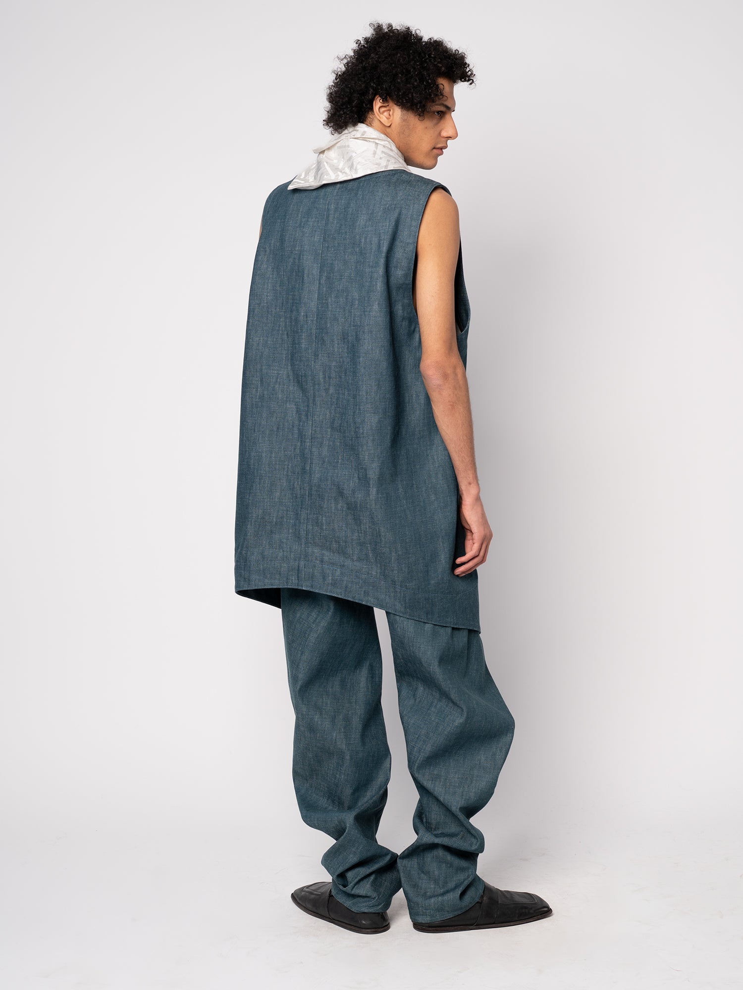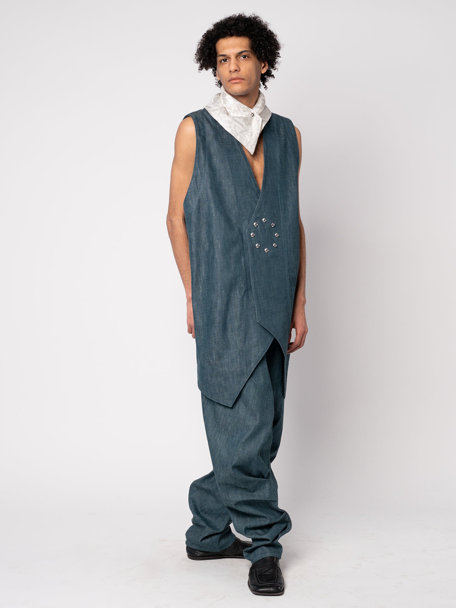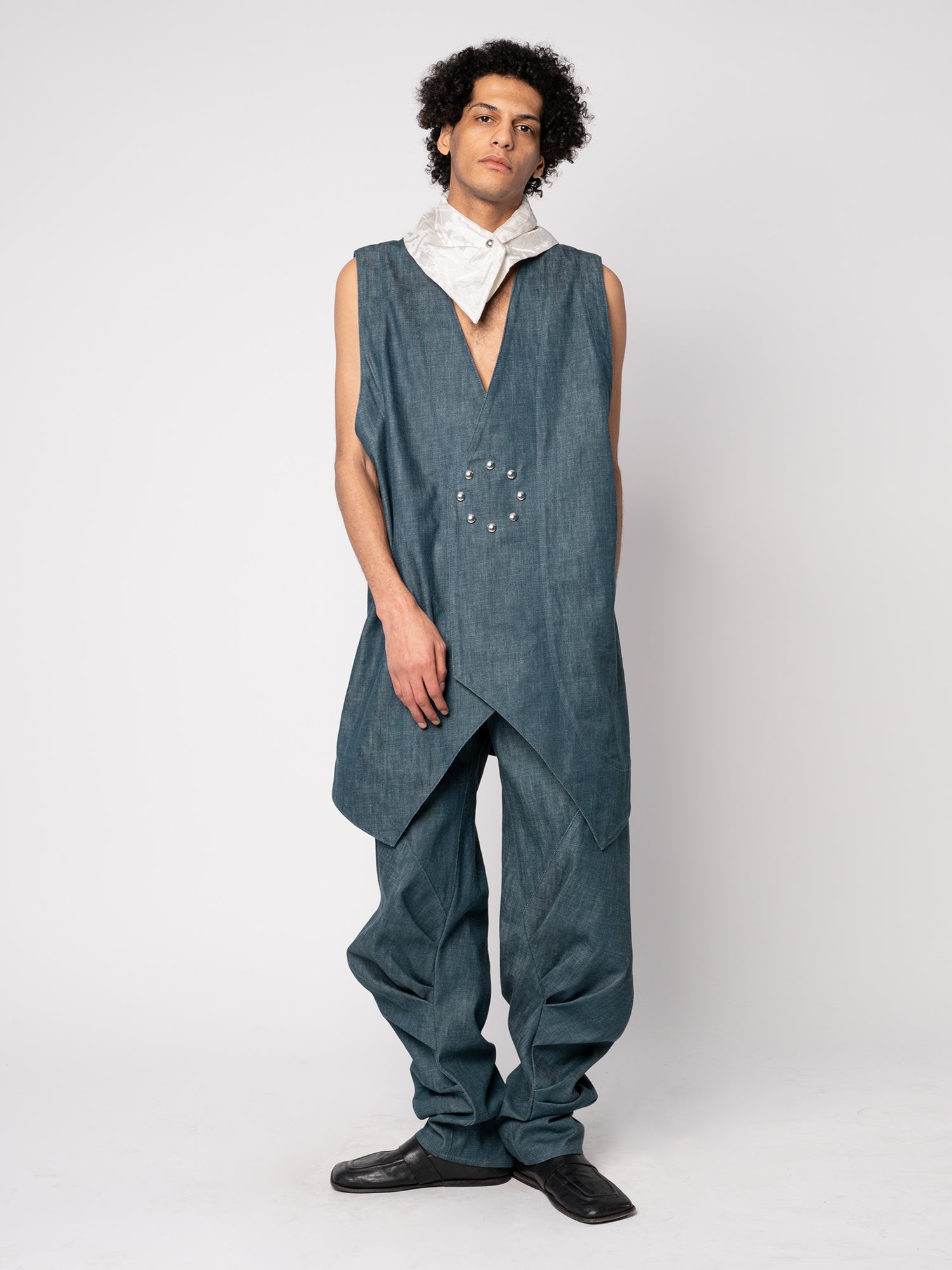 This long, oversized waistcoat is made from 13oz, mid-blue, raw denim with a hint of green from Kuroki Mill in Japan. It features rounded snaps placed in a circular shape.